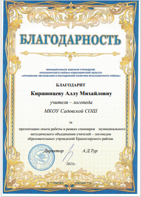 Благодарность Муниципальное казённое учреждение Краснозерского района Новосибирской области "Управления образования и молодёжной политики Краснозерского района" за презентацию опыта работы в рамках семинаров муниципального методического объединения учителей-логопедов Краснозерского района, 2023 год.