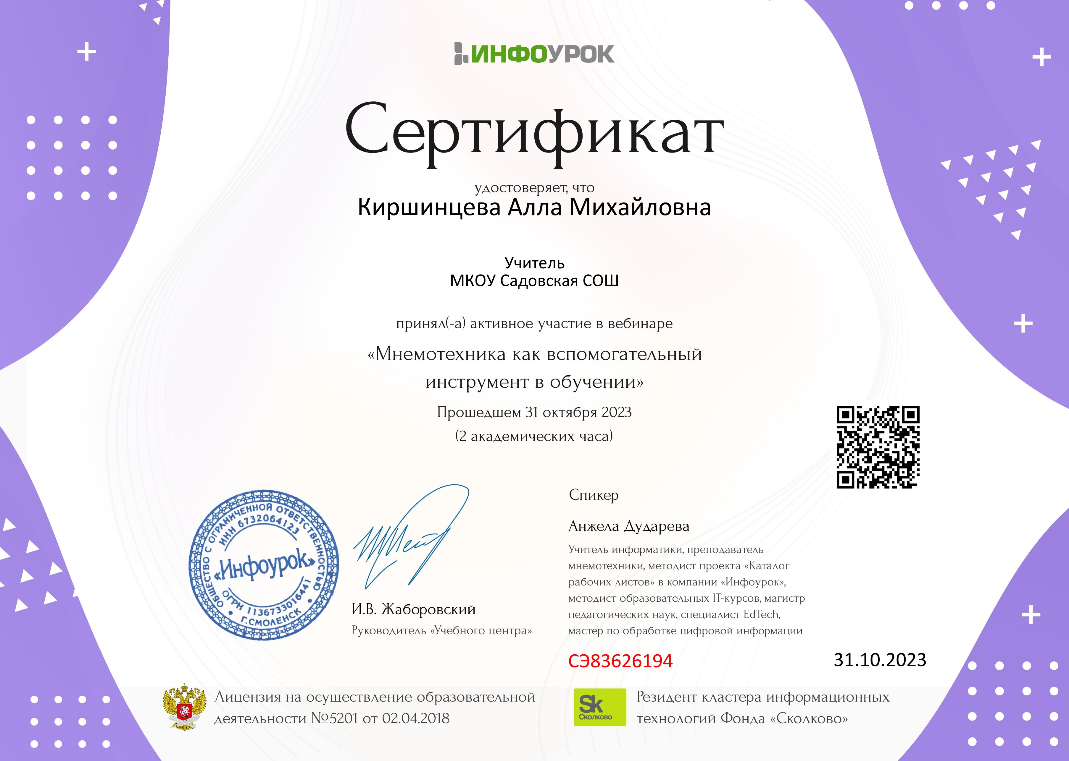 Сертификат участника вебинара "Мнемотехника как вспомогательный инструмент в обучении", 2 часа, 2023 год.